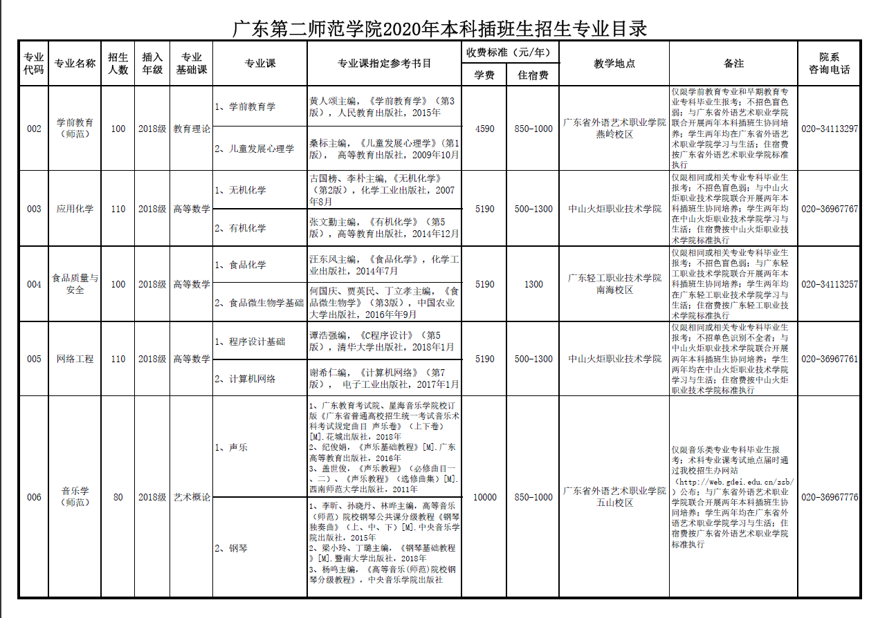 我校2020年本科插班生招生计划500人,均采用与高职院校联合开展本科插班生协同育人,考生被我校录取后,大三、大四两年均在高职院校学习和生活。2020年与我校联合开展本科插班生协同育人的高职院校为:广东省外语艺术职业学院、广东轻工职业技术学院和中山火炬职业技术学院。具体分专业对应的招生计划、协同育人高职院校和校区等信息详见《广东第二师范学院2020年本科插班生招生专业目录》。