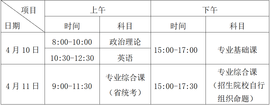 (四)普通专升本招生考试时间为2021年4月10日(星期六)至11日(星期日)两天,具体安排见下表: